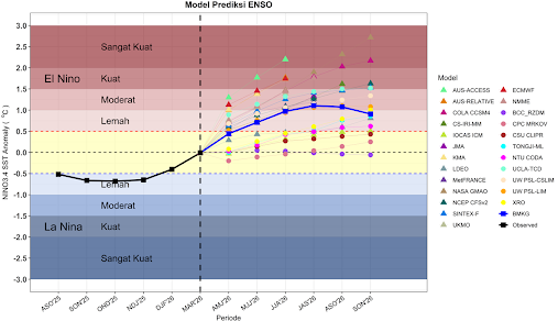 Sementara itu, Deputi Bidang Klimatologi BMKG, Ardhasena Sopaheluwakan, mengungkapkan adanya potensi kemunculan fenomena El Niño pada paruh kedua tahun 2026. Meski saat ini kondisi ENSO dan Indian Ocean Dipole (IOD) masih berada pada fase netral, hasil pemodelan iklim menunjukkan peluang pergeseran menuju El Niño.